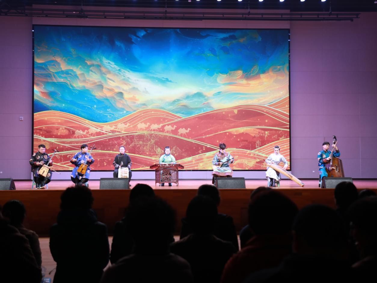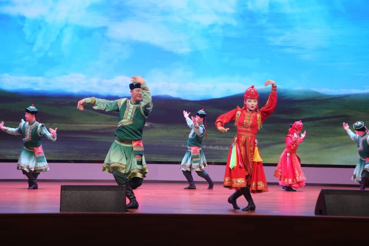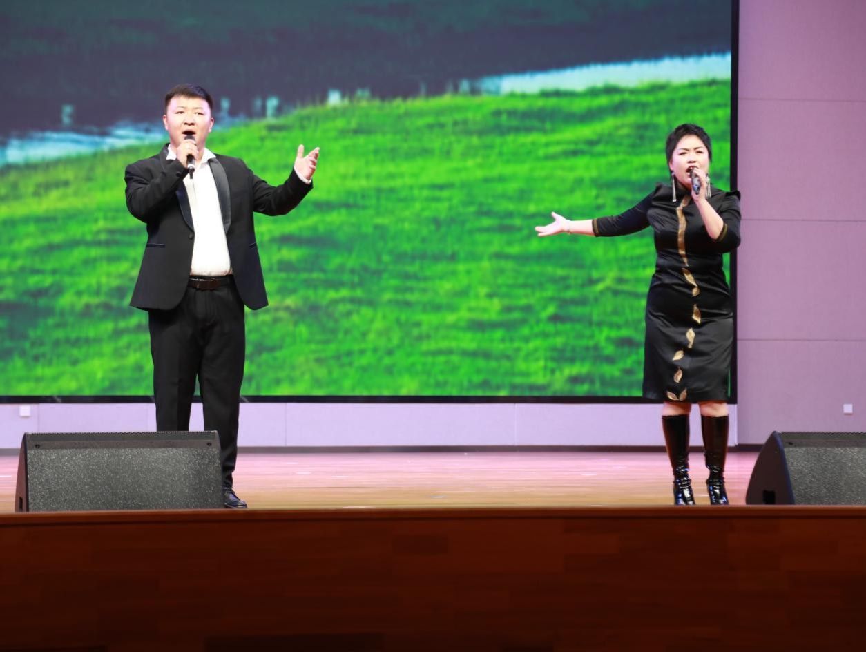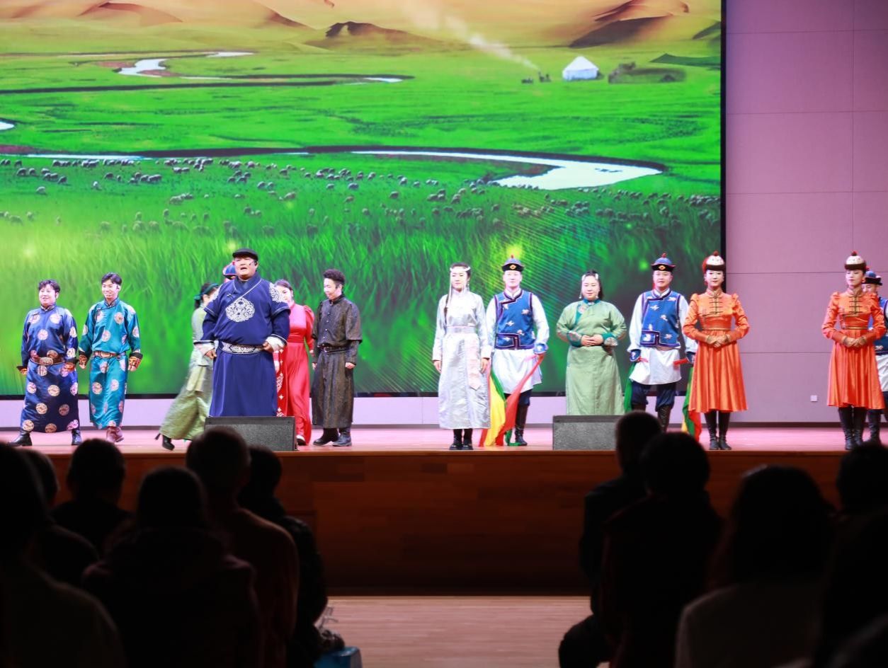 将现场气氛推向高潮的,是我校辅导员李楠森与乌兰牧骑演员共同演绎的《乌兰巴托的夜》。这支跨越地域的合作曲目,以汉蒙交融的演唱形式,唱响了“民族一家亲”的深厚情谊,生动诠释各族儿女守望相助、团结奋斗的时代主题。演出最后在全体演员与观众齐声高唱《歌唱祖国》的激昂旋律中圆满落幕,歌声汇聚成团结奋进的磅礴力量,传递出各族儿女同心共筑中国梦的坚定信念。