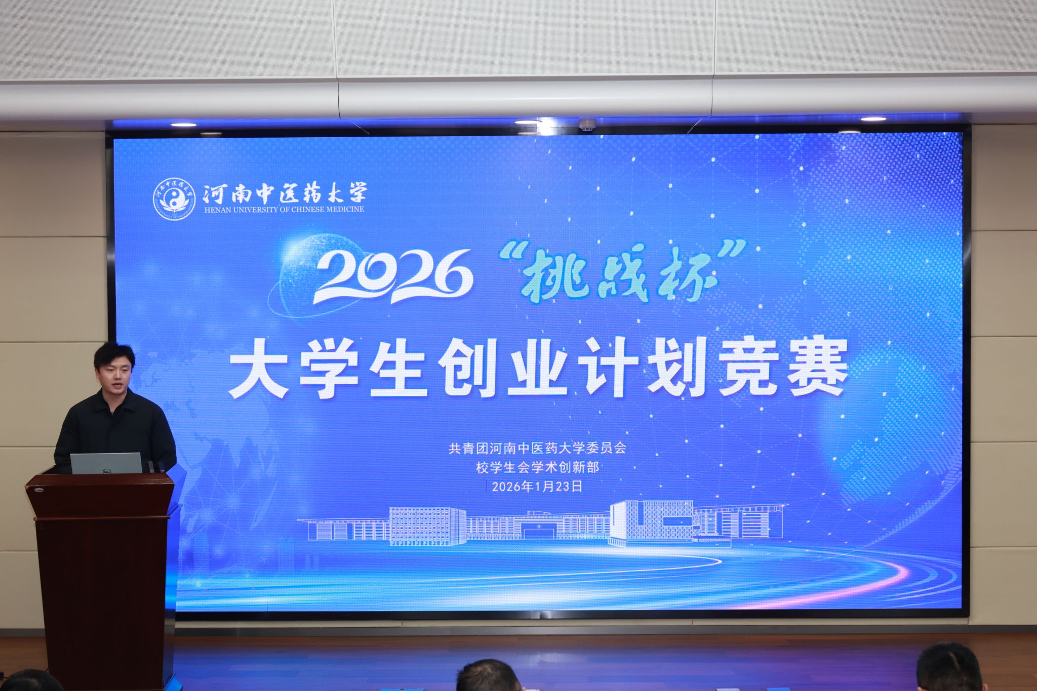 本网讯(文/图 校团委)2026年1月23日,我校在俊学楼学术报告厅成功举办本年度“挑战杯”大学生课外学术科技作品竞赛决赛。本次大赛以“科创赋能中医药,青春奋进新征程”为主题,集中展示了21项体现中医药特色与科技创新融合的优秀作品。